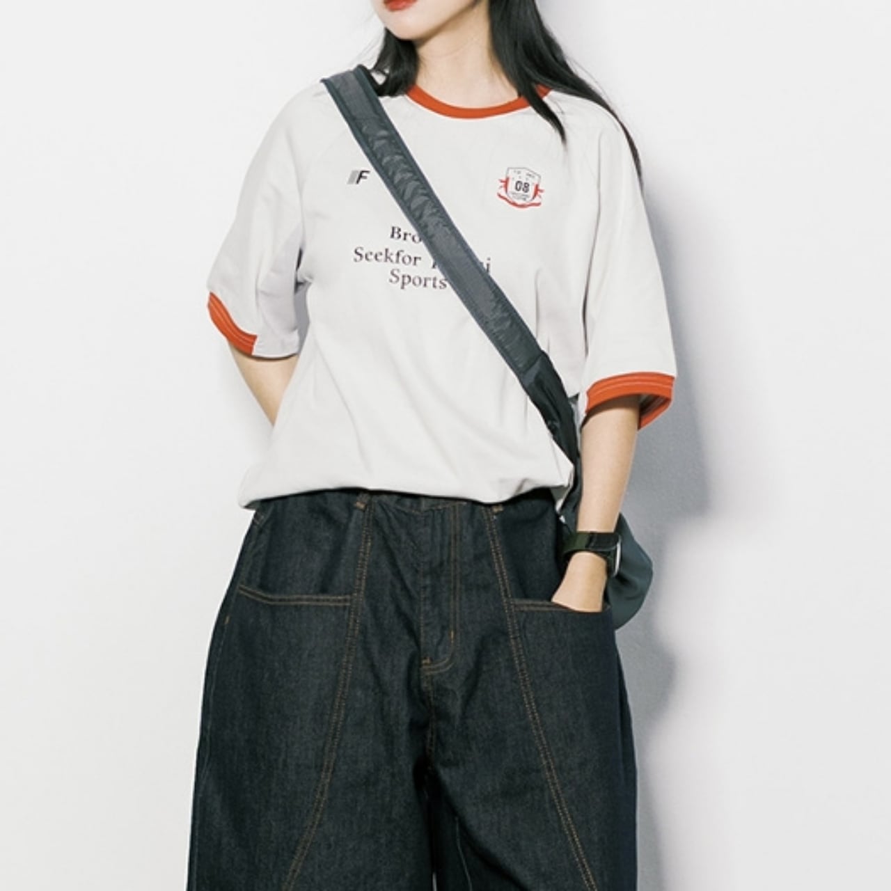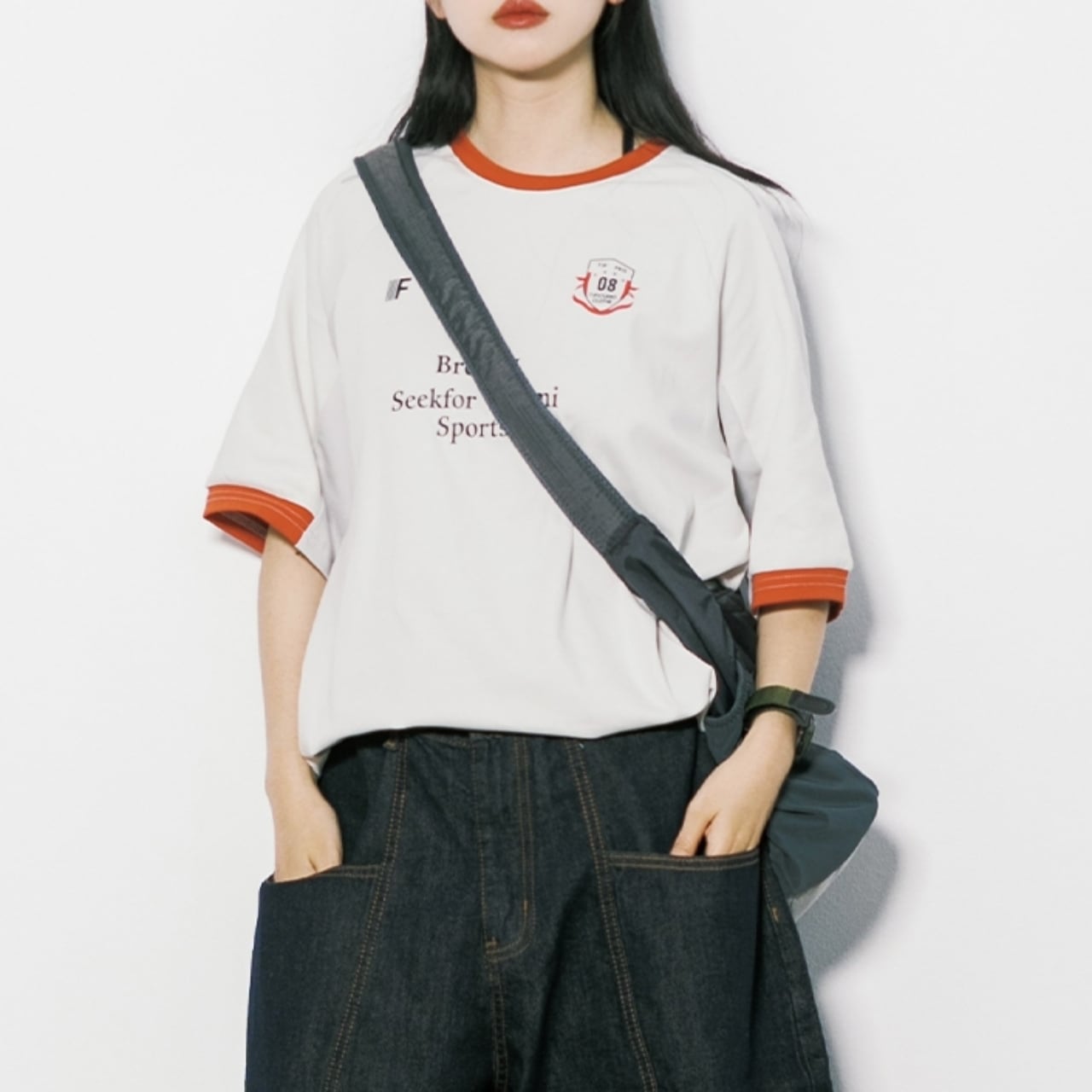 ロゴプリントが目を惹く、ラグランスリーブの半袖Tシャツ。