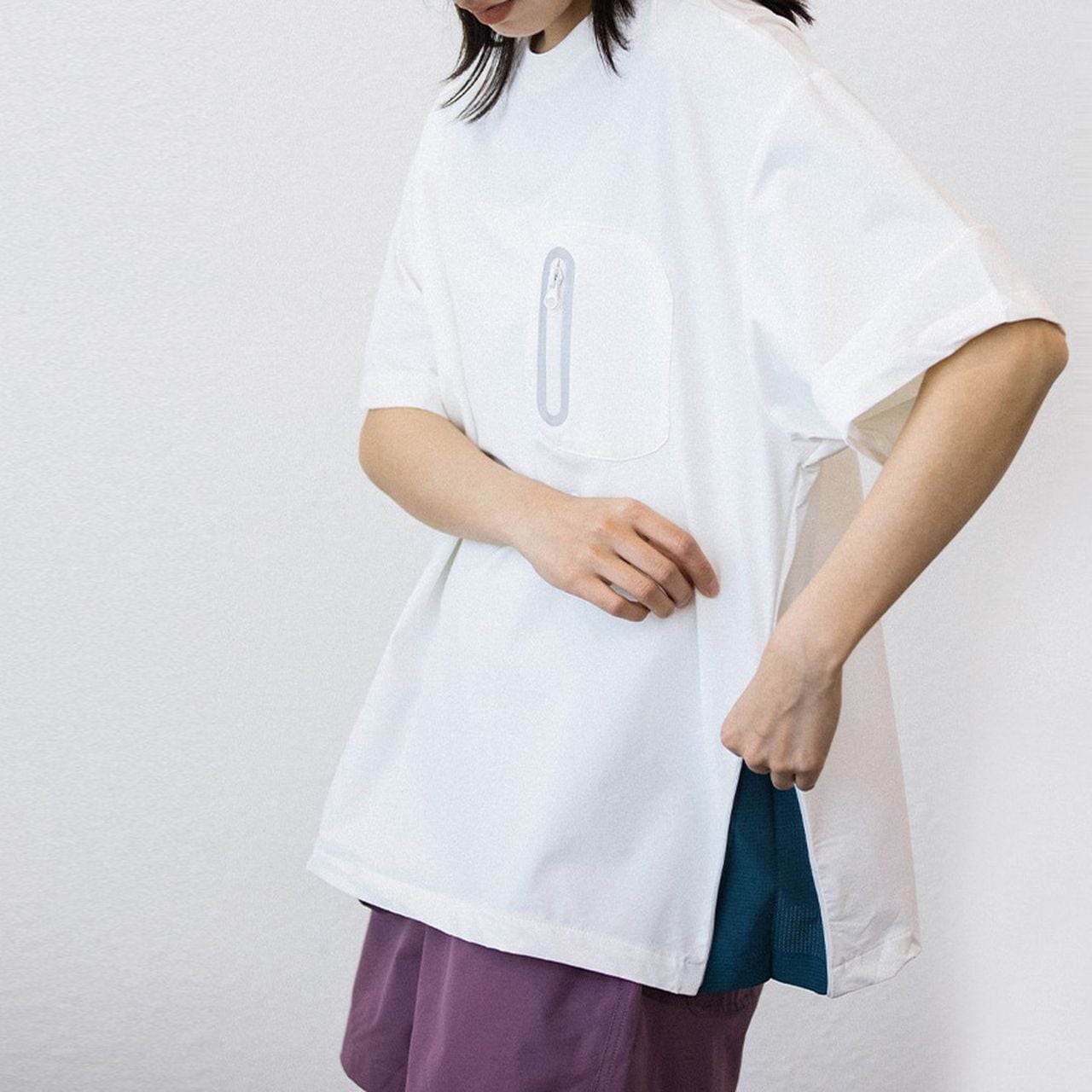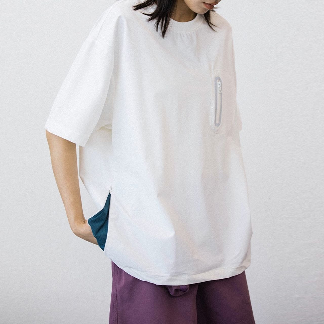 特徴的なサイドスリットとボックスシルエットが魅力のTシャツ。