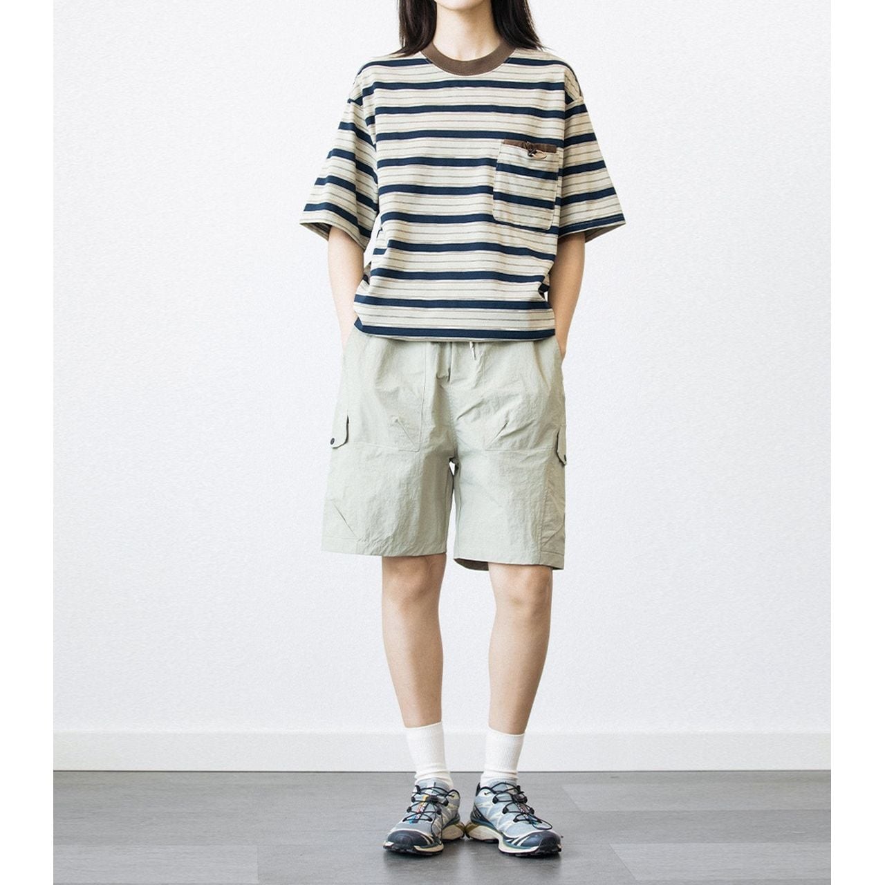 膝丈のカーゴポケットショートパンツ。