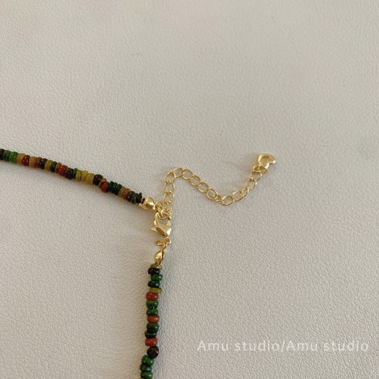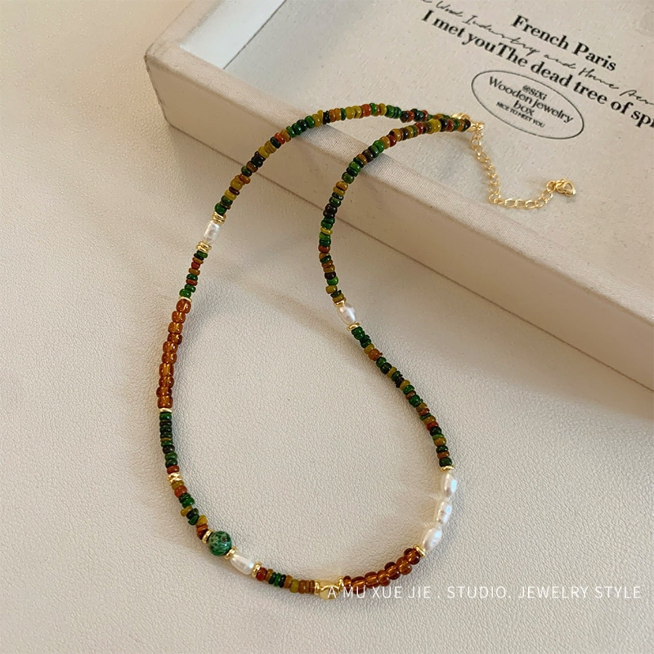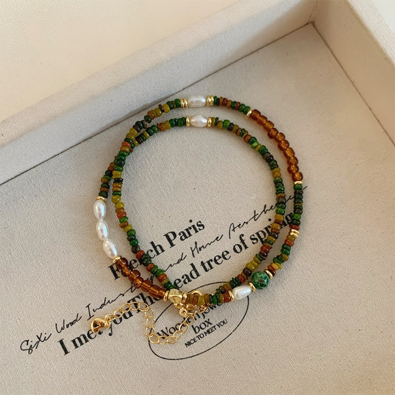 マルチカラーのビーズとパールが織りなす、繊細で華やかなネックレス。