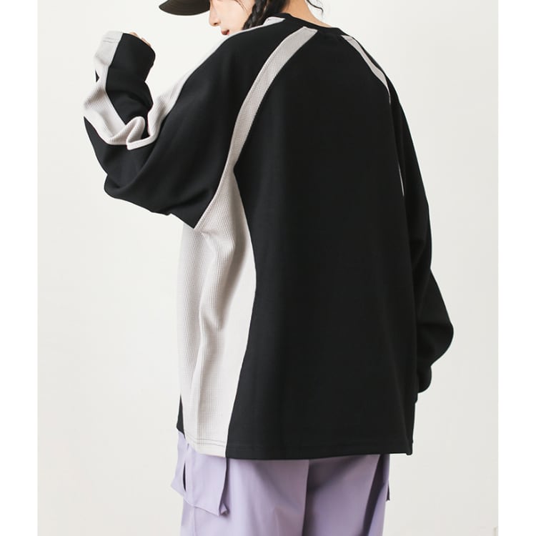 ツートンカラーが目を惹くスタンドカラーロングスリーブトップ。