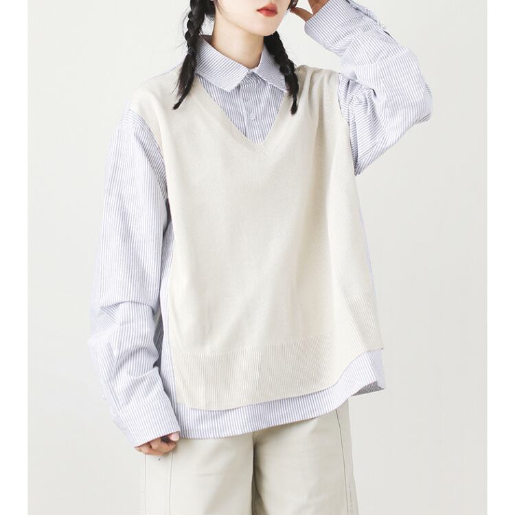 V-neck knit vest and striped oversized shirt ‐1col‐ A0631